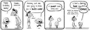 When I was first doing the strips, I’d just sort of make them whenever something notable happened. It was really hard to find time to make strips when our kids were very young, because of the demands on our parenting time. We were usually just so tired–I don’t have many strips from that era, though I wish I’d kept better notes because funny stuff was happening all the time. Nowadays I try to be pretty regular about creating strips. My goal is one a week. It’s a challenge to fit it into my schedule with everything else we’ve got going on, both with our family obligations, church service, and professional development (after-hours work projects) in addition to my full-time work. I do think Precious Rascals has become an important document for our family though, so I try to be really regular about making strips. I find that they’re easier to do if I get them done earlier in the week, so I usually try to find time on Monday or Tuesday. Then I can balance the rest of the demands of the week, knowing I’ve fulfilled my comic strip goal! (I also reward myself with chocolate.)