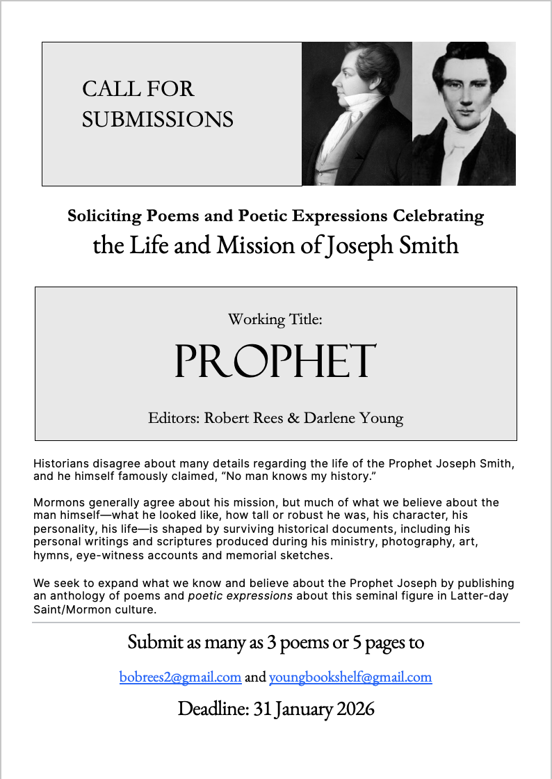 Robert Rees and Darlene Young are seeking submissions of poetry and poetic expressions for an upcoming anthology about Joseph Smith (tentatively titled Prophet). See attached flyer for more information. Deadline January 31, 2026.