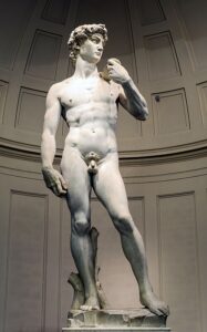 I am not the only one who has thought that way either. Michelangelo spoke of “liberating” the sculpture from the stone, a clear homage to his deeply Neoplatonic understanding of the world. For Plato and his philosophical descendants, a world of Forms exists separately from our day-to-day perception where the perfected versions of everything reside. That’s a brutish summary of Platonic forms, but Michelangelo’s intent was that the statue David would be a physical manifestation of this idealized Form of Man. Beyond this still, Michelangelo was not just sculpting a man. He specifically sculpted David, and as far as masculine Biblical figures go, the young David is a good contender for the most idealized in terms of physical strength mixed with spiritual acuity.